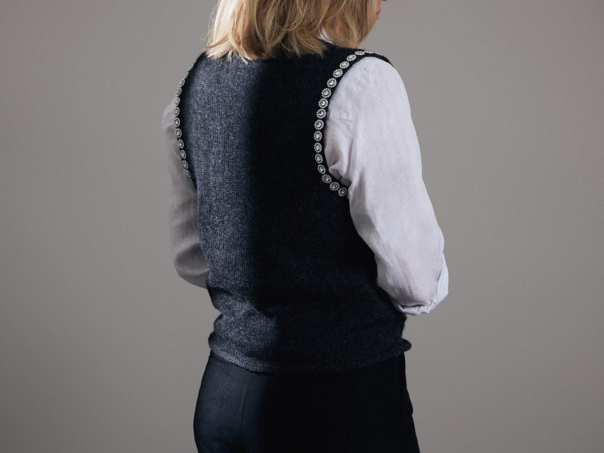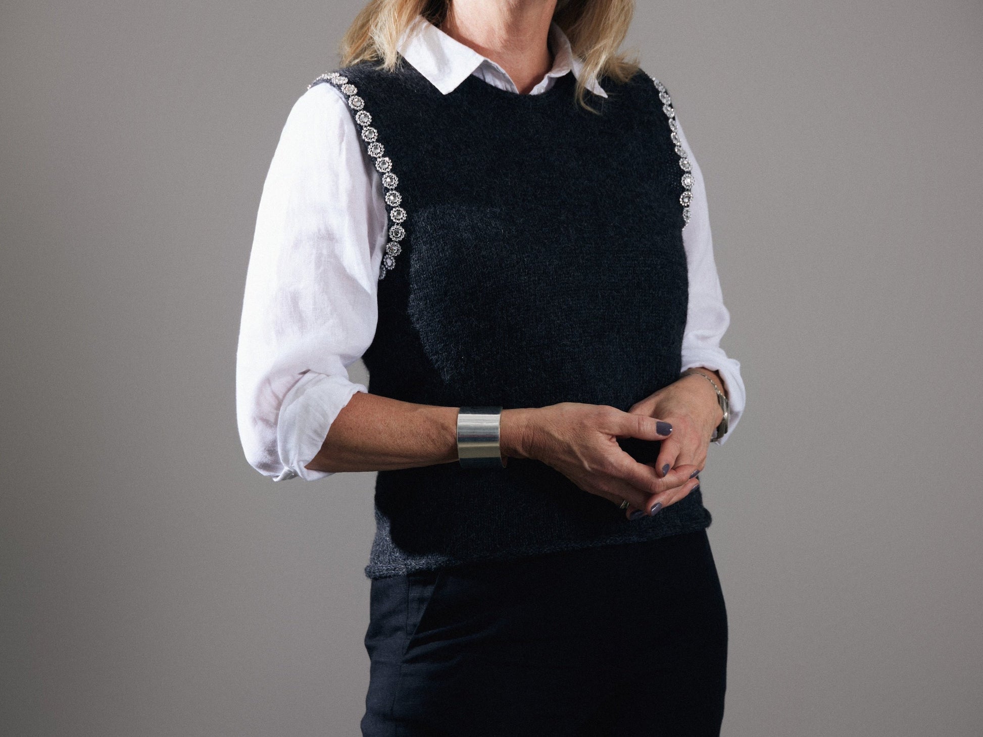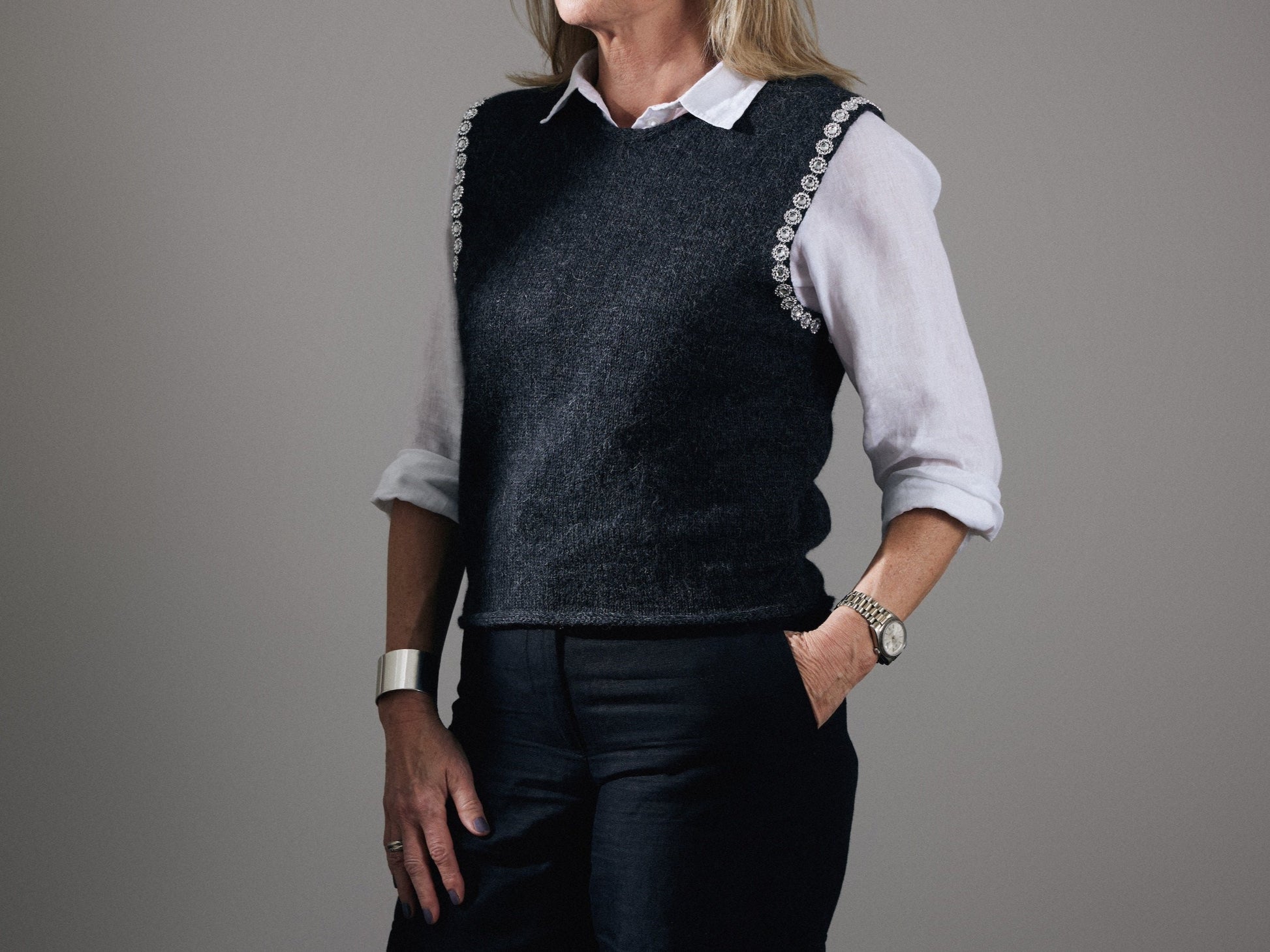 Bella är monteringsfri och stickas uppifrån och ner i slätstickning i Superfine alpacka. Först stickas översta delen av ryggen med ökningar för att forma rundningen vid ärmhålet. Därefter plockas det upp maskor längs uppläggningskanten till axlarna. För att fån en bra lutning på axlarna stickas de var för sig med förkortade varv innan de förs samman och bildar framstycket. Ökningar görs vid ärmhålet innan fram- och bakstycke förs ihop. Bålen stickas sen runt på rundsticka med minskningar i sidorna för en något avsmalnande form och avslutas med en I-cord kant längst ner, liksom runt halsöppningen. Längs ärmhålen sys ett glittrigt kantband på. Bella har en lös passform och bör mäta ca 5-10 cm mer än ditt bystmått.