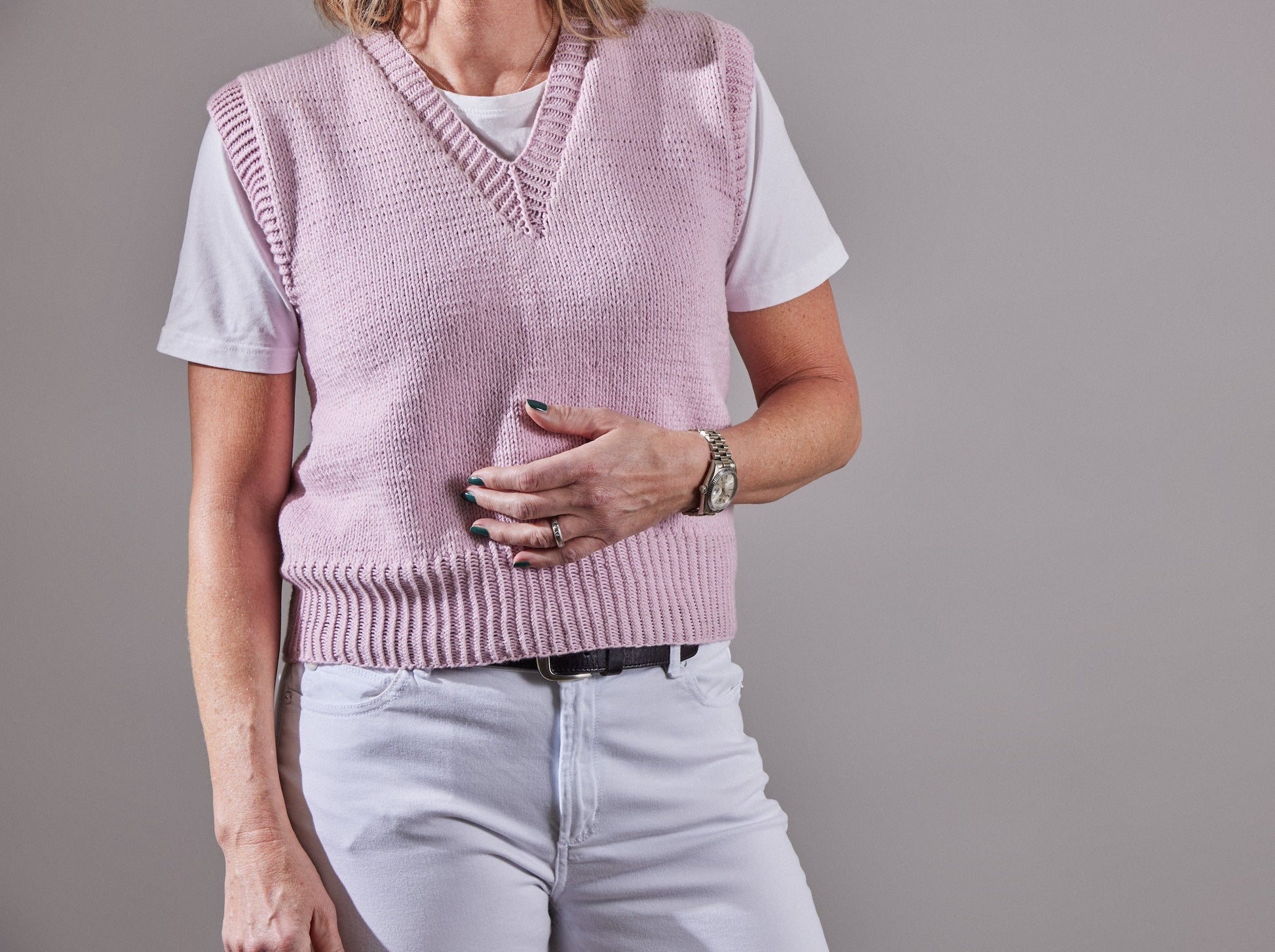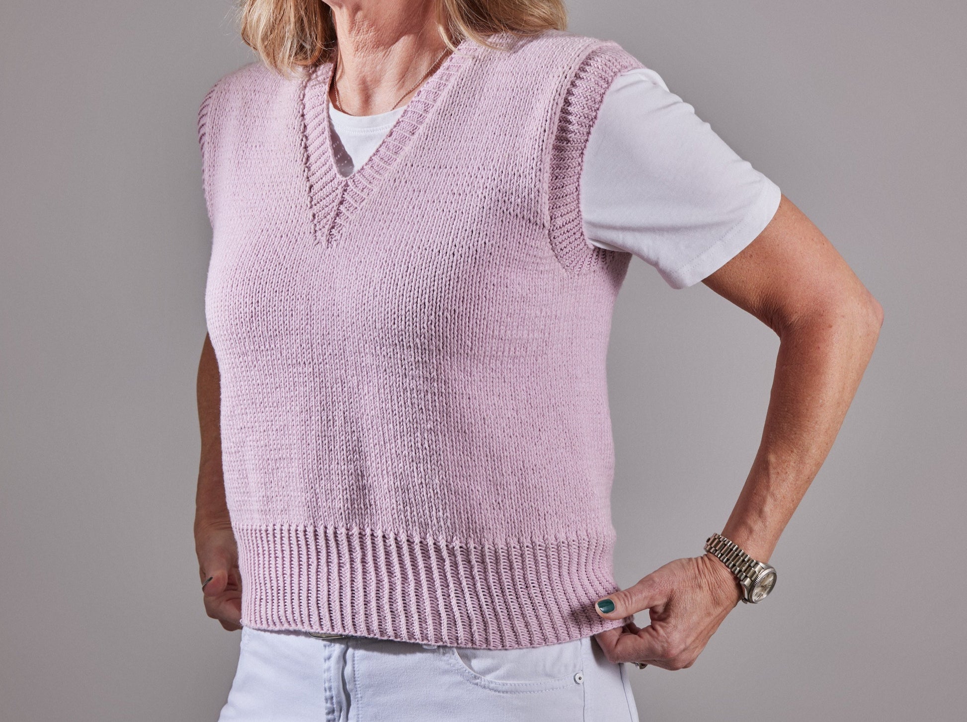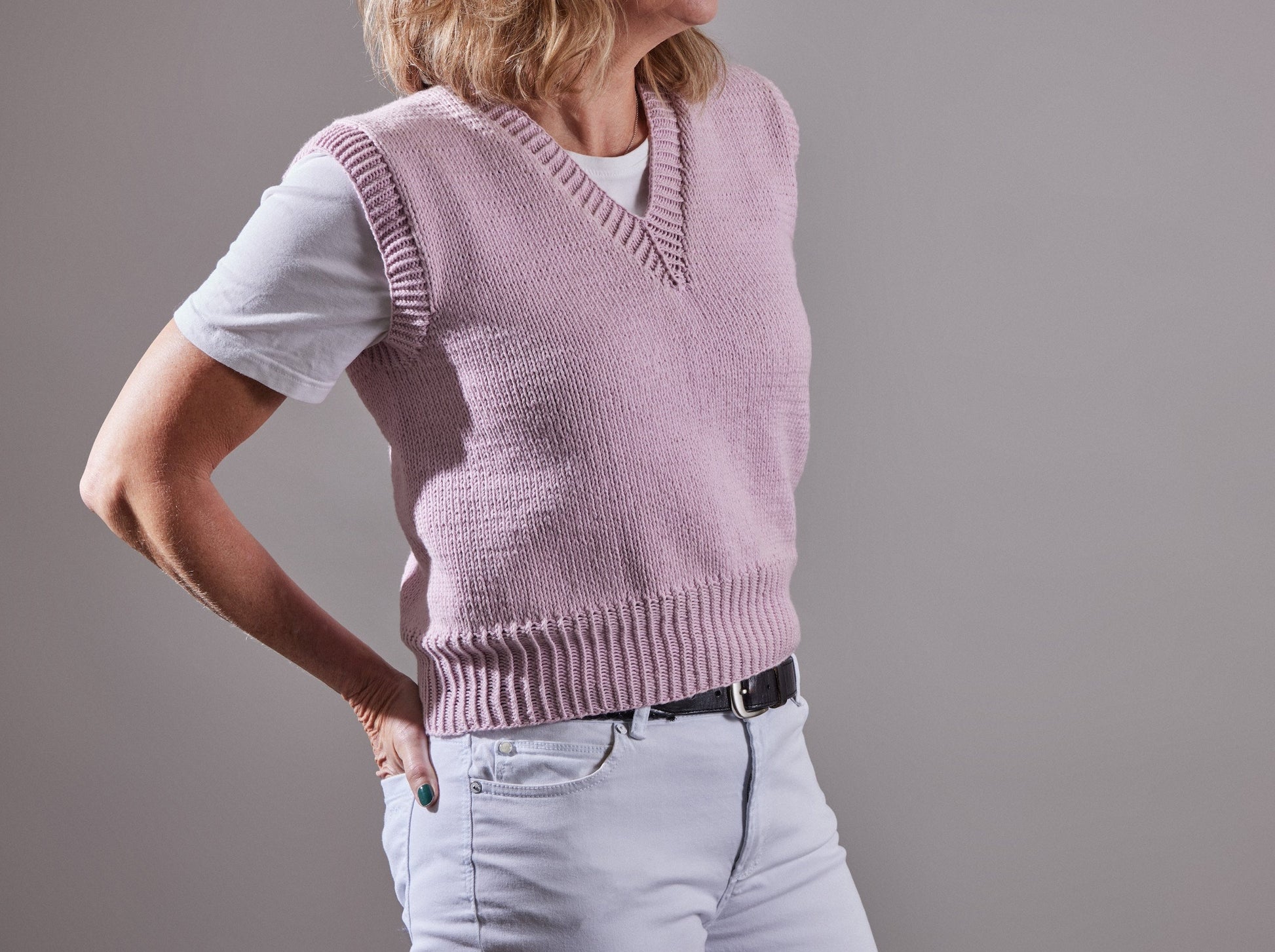 Västen Charlie stickas med dubbel tråd uppifrån och ner, först stickas ryggstycket, sedan axelpartierna från uppläggningskanten. Med förkortade varv får axlarna en lutning så att det blir en bra passform. Axelpartierna förs ihop och bildar så V-ringningen. Till sist stickas bålen genom att axelpartierna och bakstycket stickas ihop, avslut i vriden resår med en tråd. Längs V-ringning och ärmhål stickas det kanter med vriden resår (en tråd). Gör ett gärna ett stickprov innan du börjar sticka så du ser att måtten för axlar mm stämmer. Passformen är relativt tight upptill då modellen är rak, du bör välja en storlek med ca 3-5 cm mer än ditt bystmått.