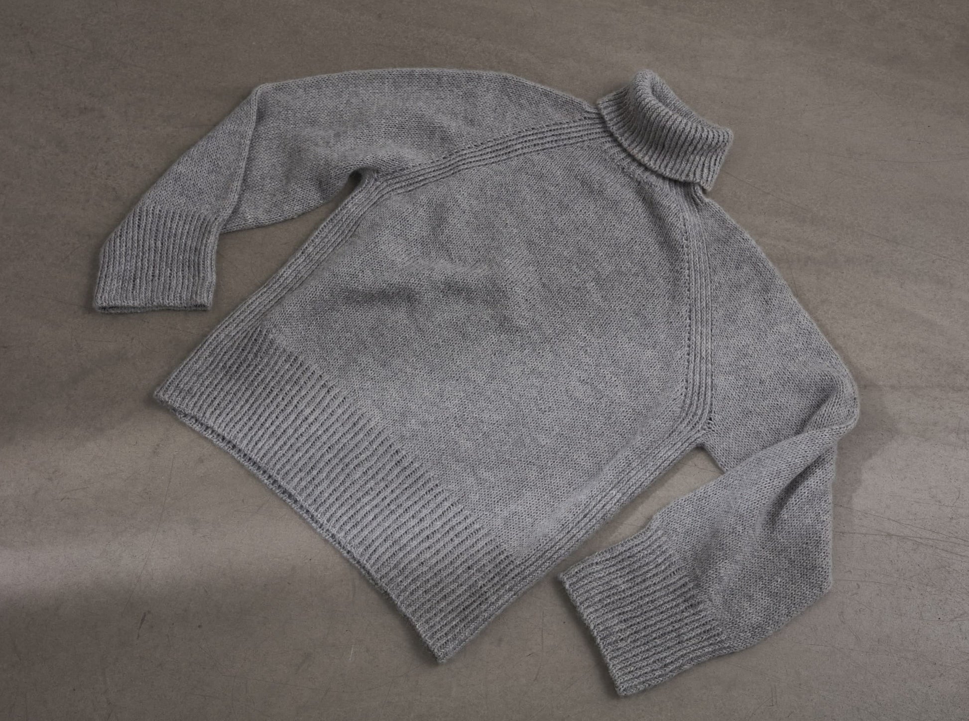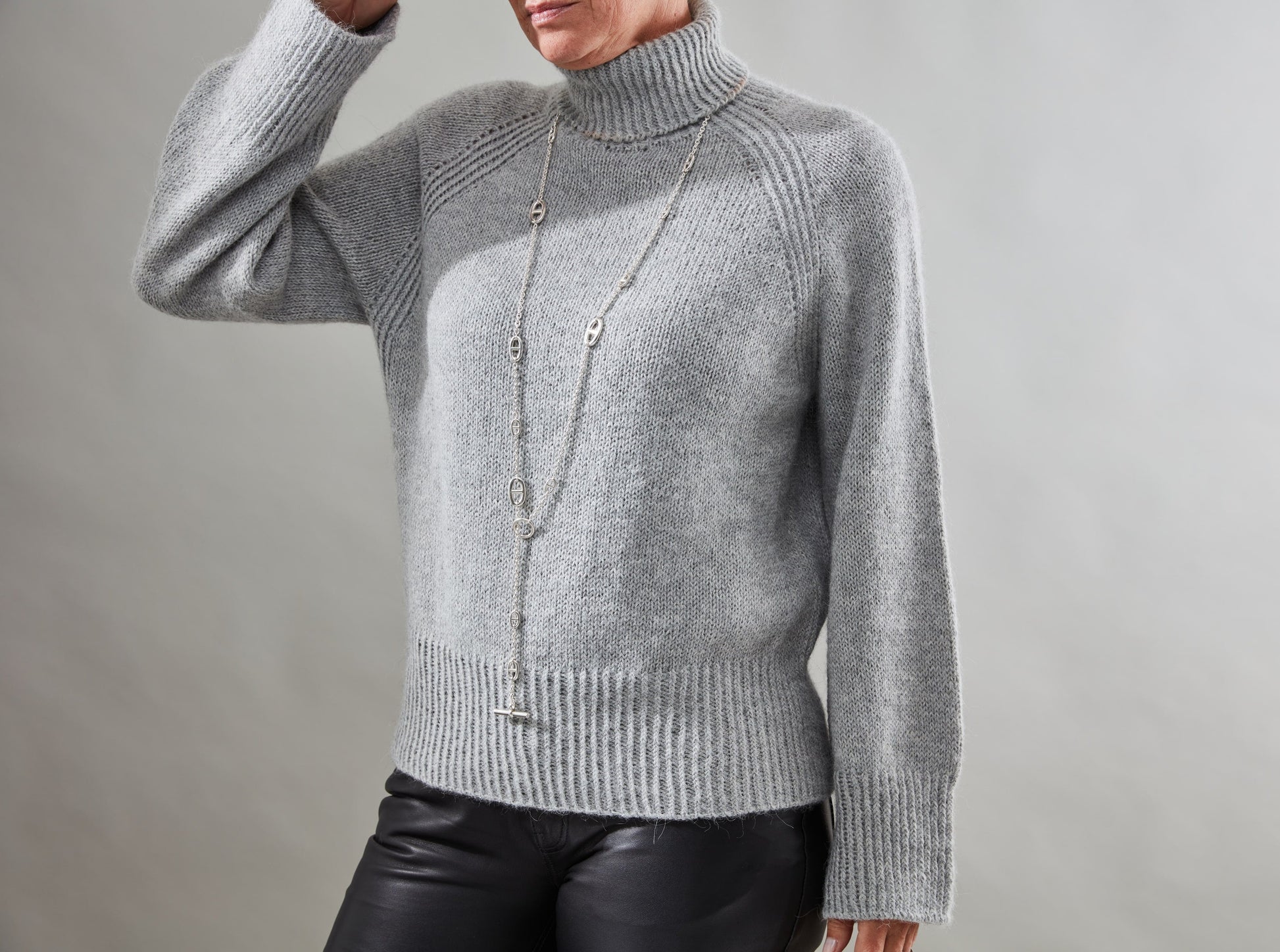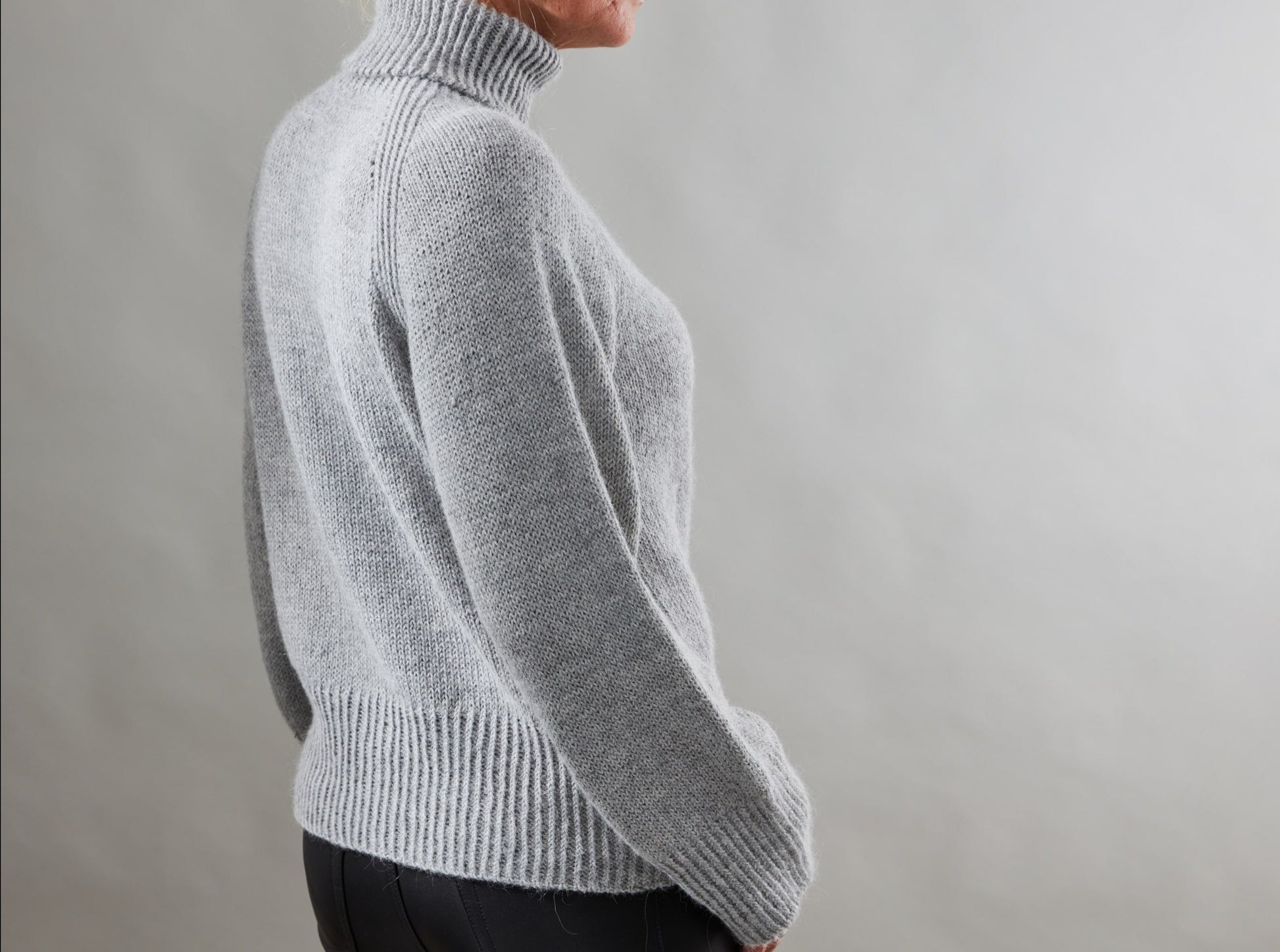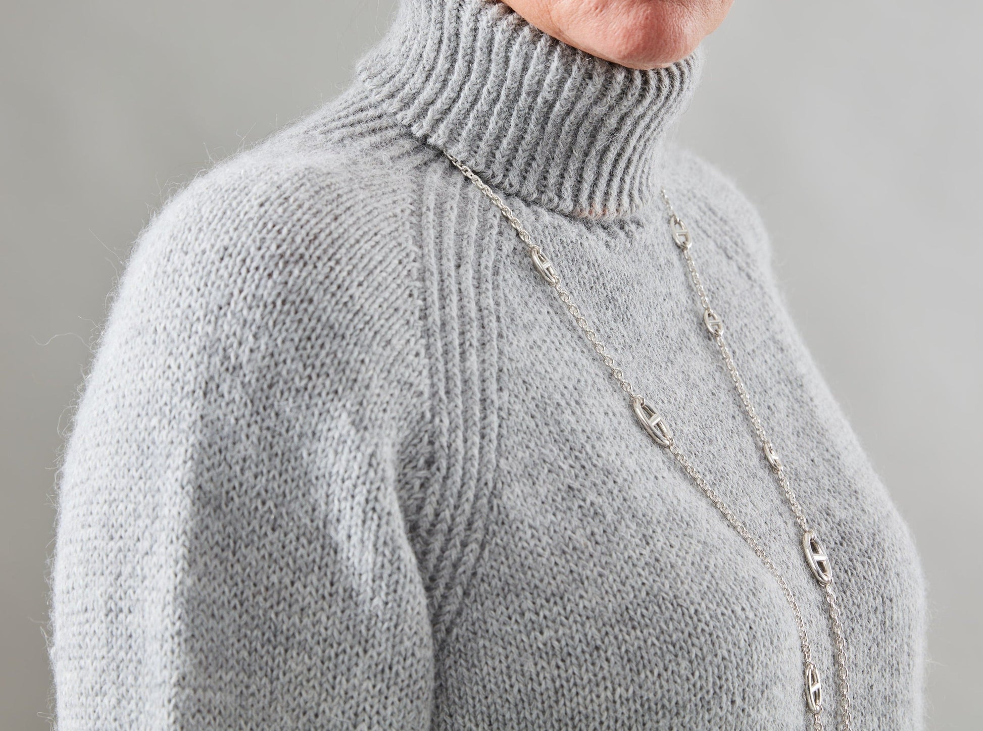 Polotröjan Ebba är helt monteringsfri och stickas uppifrån och ner i slätstickning samt vriden resår i krage, muddar, vid raglanökningar och längs sidorna. Garnet är mjukt alpackagarn från Miss Svensson och passar den som är känslig för garn som sticks. Efter polokragen stickas förkortade varv för att få bra passform. När oket är stickat med raglanökningar och vriden resår delas arbetet så att ärmarna sedan kan stickas för sig. Fram- och bakstycke förs ihop och stickas runt med rundsticka efter att maskor lagts upp under ärmhålet. Tröjan har en vid passform och bör ha en rörelsevidd på ca 20 cm mer än ditt bystmått.