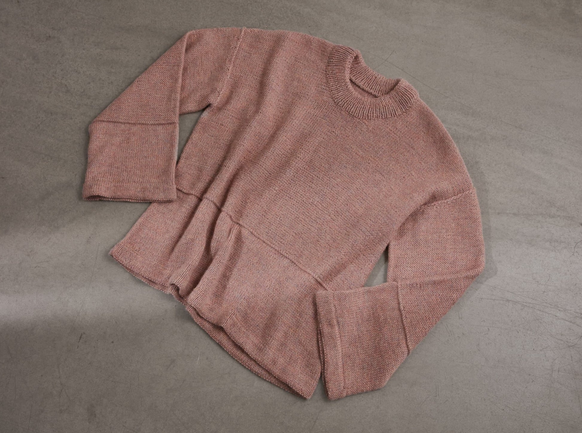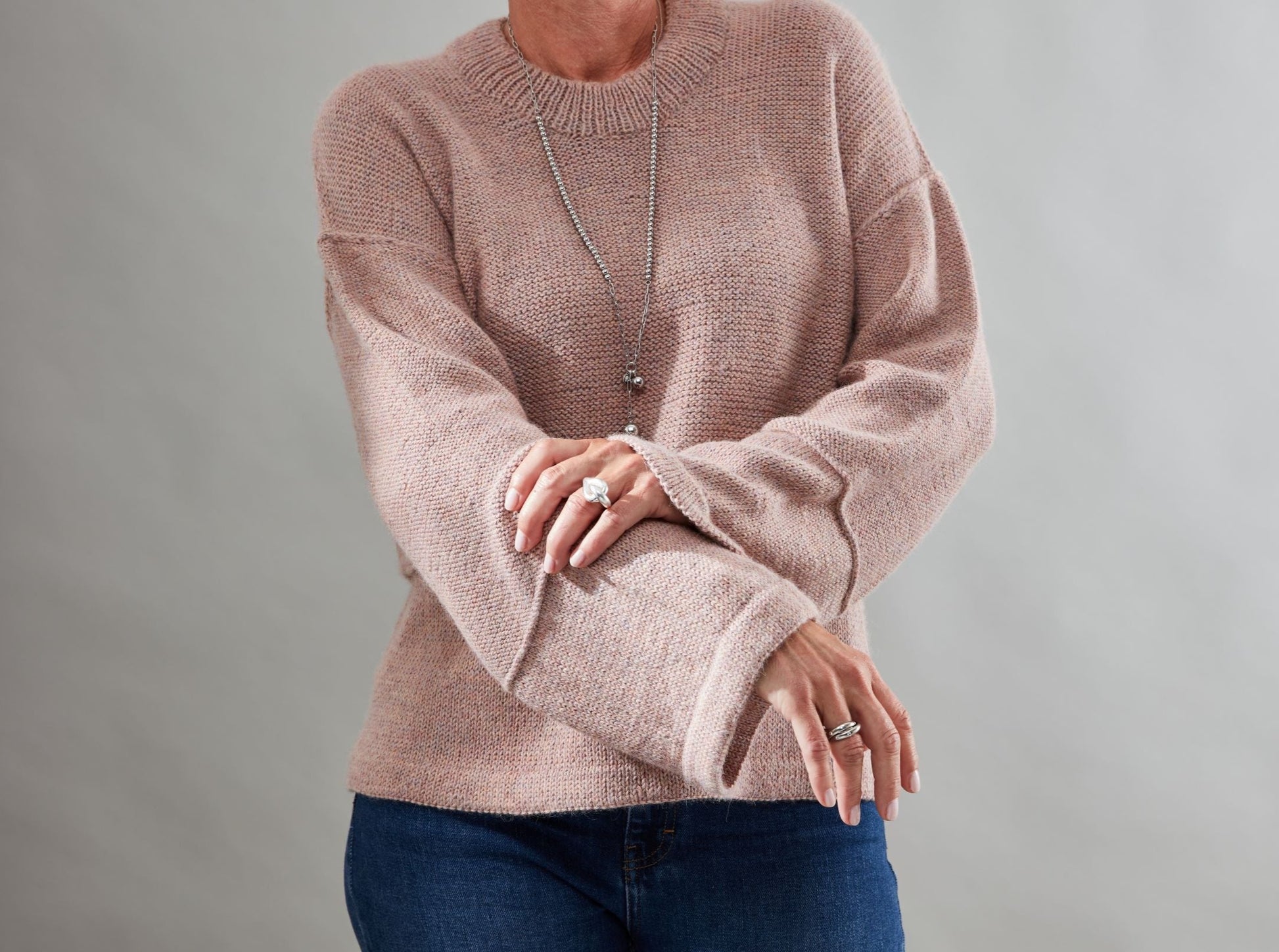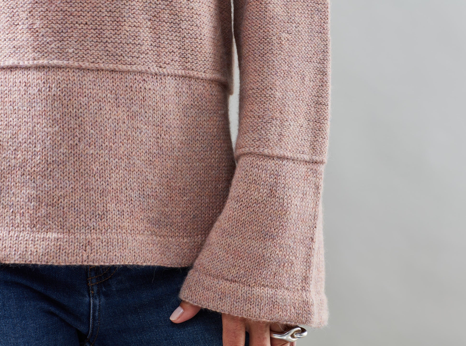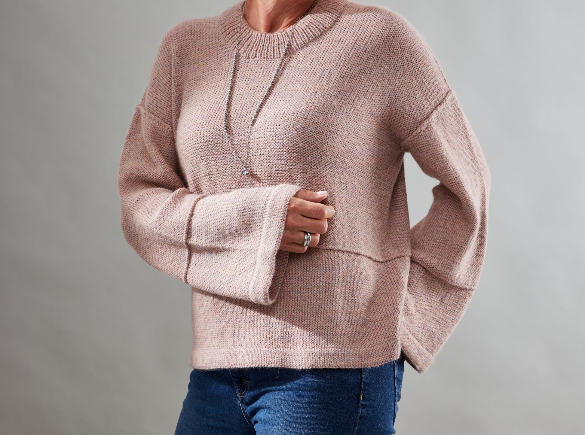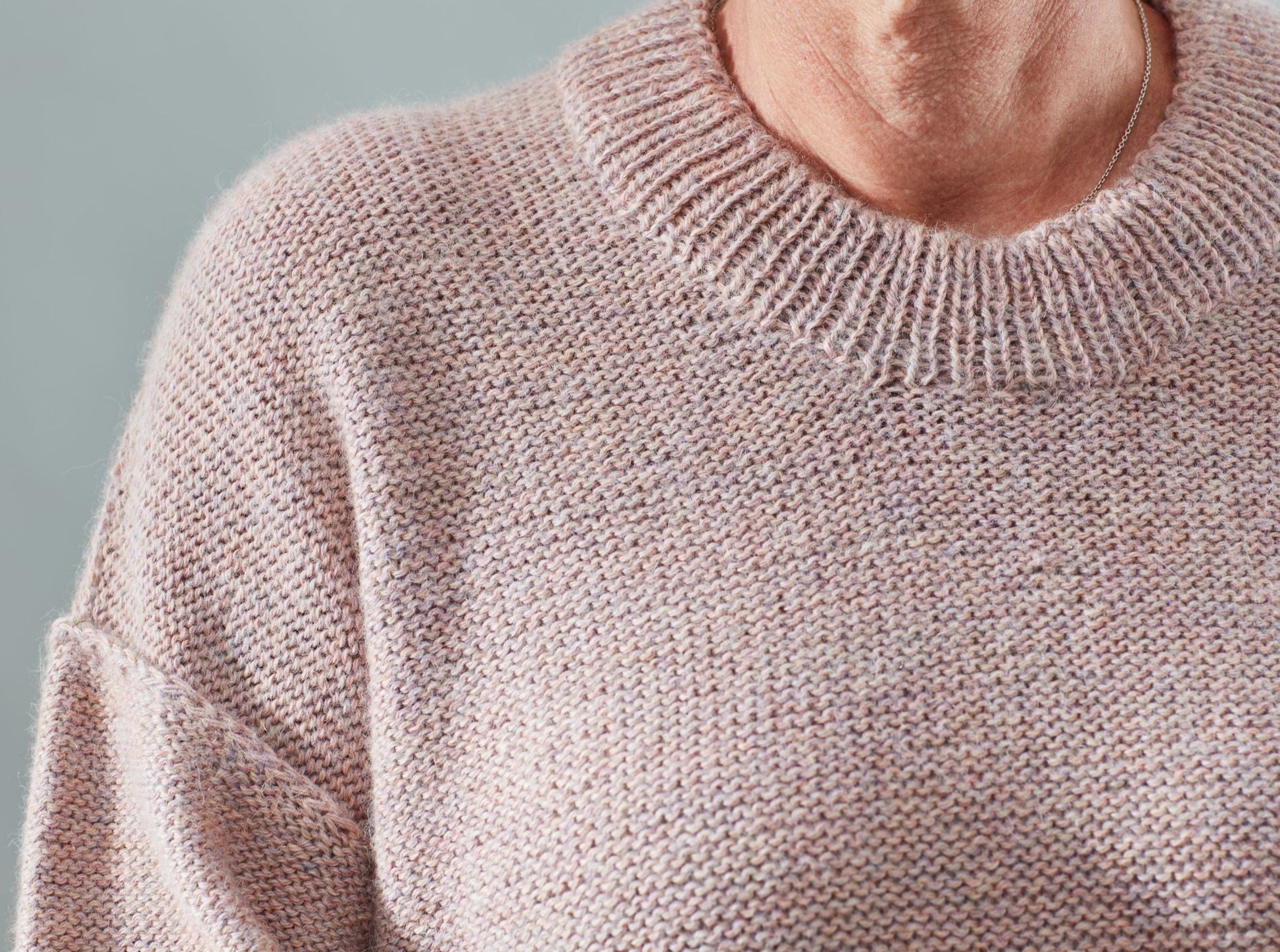 Tröjan Johanna är helt monteringsfri och stickas uppifrån och ner i slätstickning men med avigsidan utåt. Du stickar i Baby Alpaca från Miss Svensson, vilket gör tröjan supermjuk och skön. Först stickas översta ryggdelen, sedan plockas maskor upp på var sida om halsen för att sticka axlarna med förkortade varv så att du får en fin passform. Fram- och baksida förs sedan ihop och stickas på rundsticka hela bålen ner. För att få den fina ”sömmen” mellan avig- och rätpartierna maskas arbetet av och nya maskor plockas upp från insidan på tröjan. Samma sak gäller för ärmarna som stickas på en kortare rundsticka. Halsringningen stickas med en lite tunnare rundsticka, viks in och maskas av mot insidan av kragen. Tröjan har en vid och rak passform och bör ha en rörelsevidd på ca 25 cm mer än ditt bröstmått.