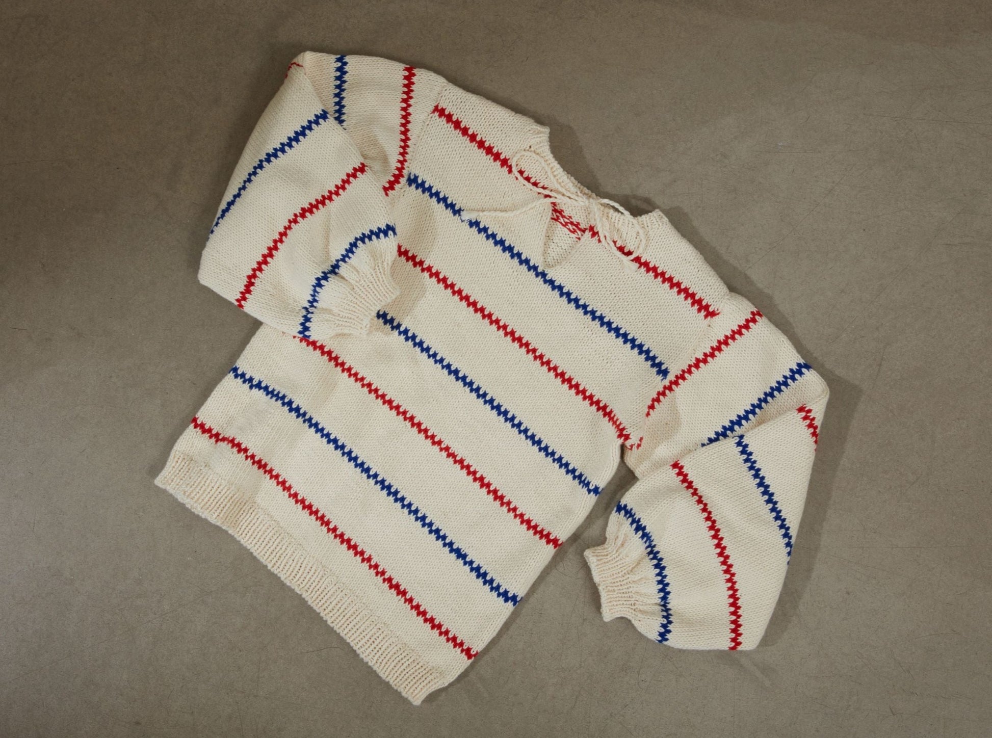 68-74 (80-86 ) 92-98 (104-110) 116-122 (128-134) 140-146 (152-158) cl Övervidd: 50 (55) 60 (65) 70 (75) 80 (85) cm Längd: 32 (35) 38 (42) 46 (49) 52 (55) cm Garn: 4 (4) 5 (5) 6 (7) 8 (9) nystan basfärg Pima bomull (Snow white), 1 nystan (alla storlekar) röd rand Pima bomull (Tulip red), 1 nystan (alla storlekar) blå rand Pima bomull (Cobalt) Stickor: Rundsticka 4 mm (40, 60 eller 80), rundsticka 3,5 mm 40 cm och strumpstickor 3,5 mm Masktäthet: 22 m x 30 varv slätstickning på stickor 4 mm = 10 x 10 cm Tekniker: Italiensk uppläggning, Italiensk avmaskning, Byta färg varannan maska, Öka 1 m, German Short Rows (förkortade varv)