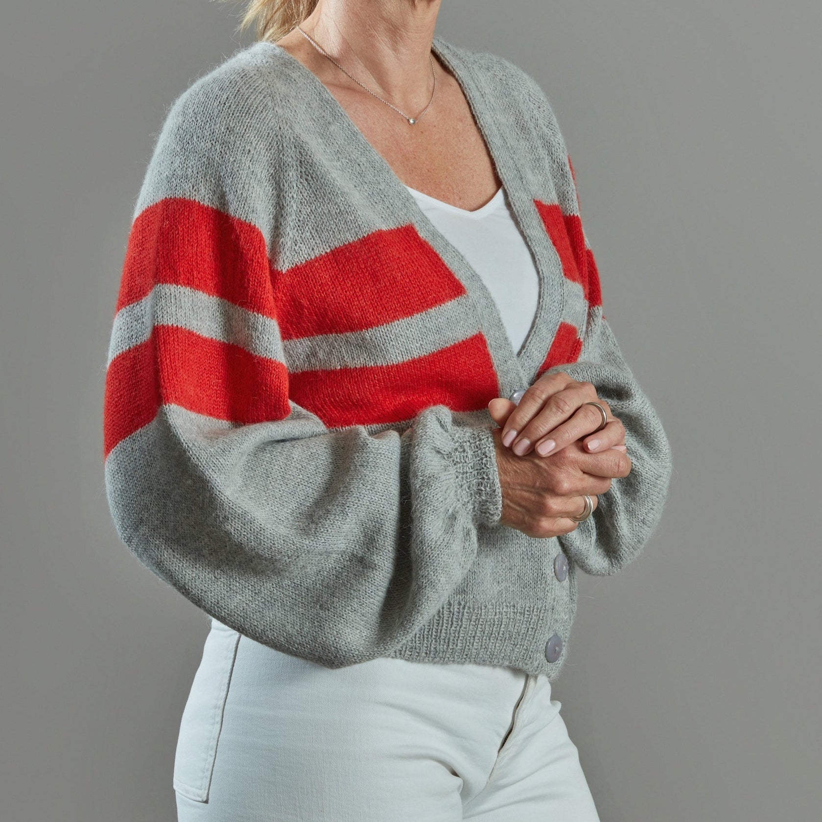Koftan Anna är helt monteringsfri och stickas uppifrån och ner med raglanökningar vid ärmar och ok samt ökningar framtill för V-ringningen. Med hjälp av förkortade varv blir koftan lite högre bak i nacken för en bra passform och ärmarna är ganska vida och raka för ett lite puffigt avslut. Sist stickas knappslån på i dubbelstickning med knapphål i höger sida. Anna har en lös passform och bör ha en rörelsevidd på ca 15 cm i förhållande till ditt bystmått. Givetvis kan du välja en annan randning och antal färger, eller helt enfärgad.