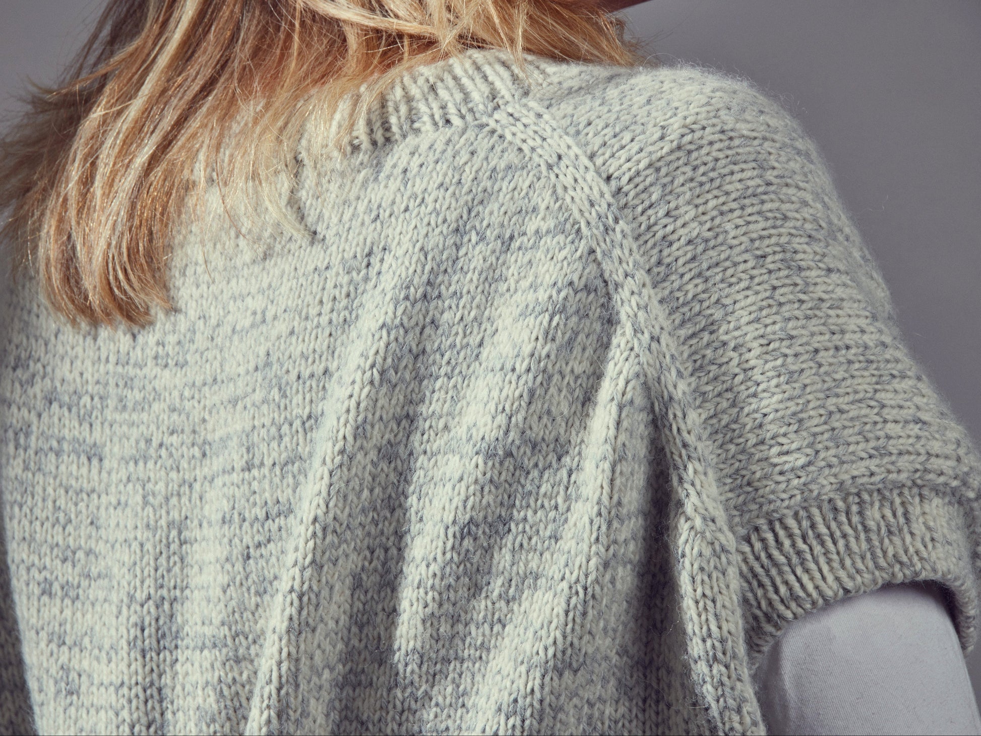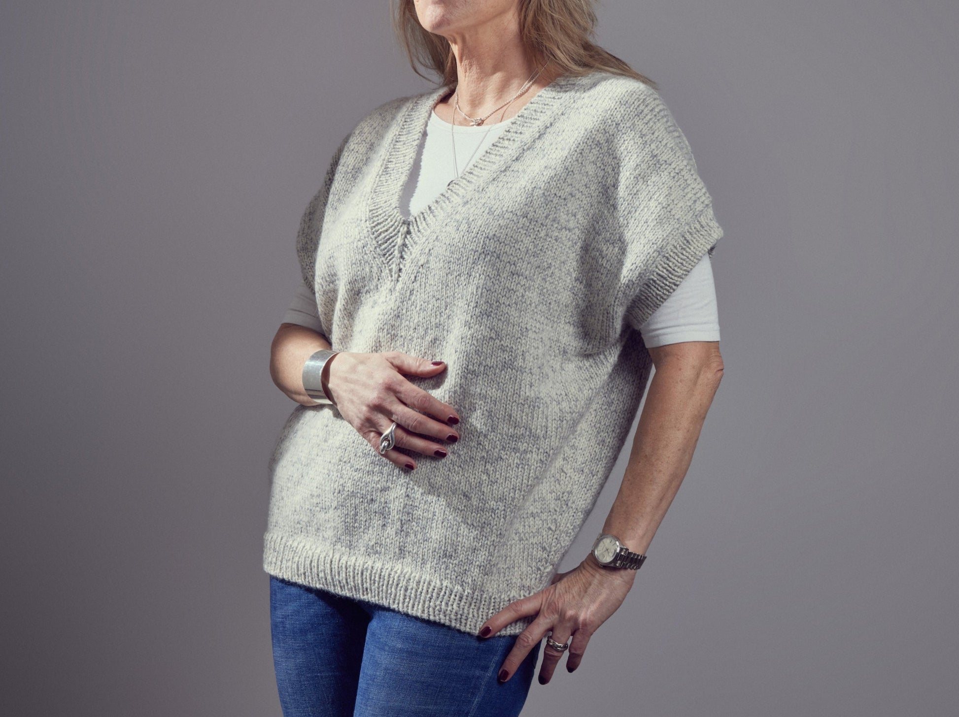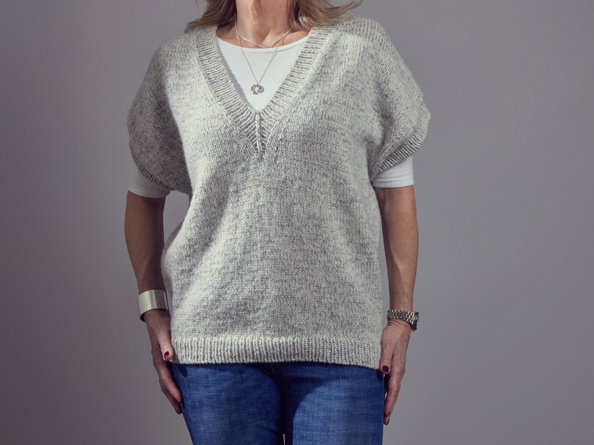 Slipovern Ida är helt monteringsfri och stickas uppifrån och ner på rundsticka i slätstickning. Längs uppläggningskanten på bakstycket görs ökningar på både rät- och avigsidan vilket skapar lutningen på skuldrorna. Därefter plockas maskor upp längs skuldersömmarna och de två axelpartierna stickas var för sig med ökningar för att skapa V-ringningen. Efter att de 2 axelpartierna stickats klart förs alla delar samman så att bålen stickas runt på rundstickan. Minskningar görs i båda sidorna för ett smalare avslut. Resåren längst ner stickas med något tunnare sticka, liksom resårkant längs V-ringning och ärmhål. Ida har en oversize passform och bör ha en rörelsevidd på ca 40-50 cm mer än ditt bystmått.